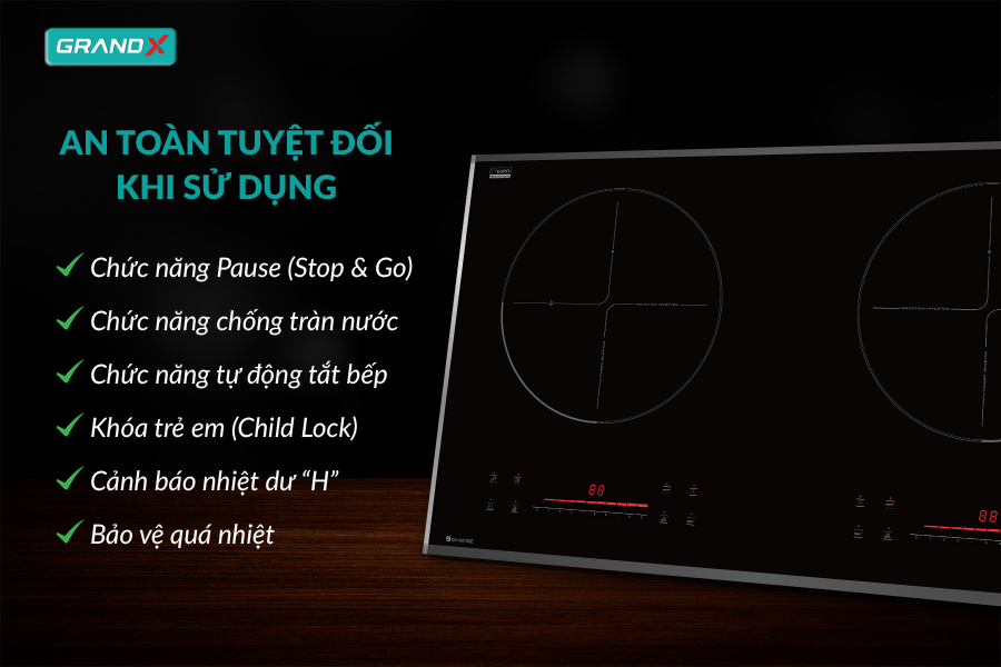 - Cảnh báo nhiệt dư “H”, hiển thị khi nhiệt độ bề mặt vượt quá 60°C.