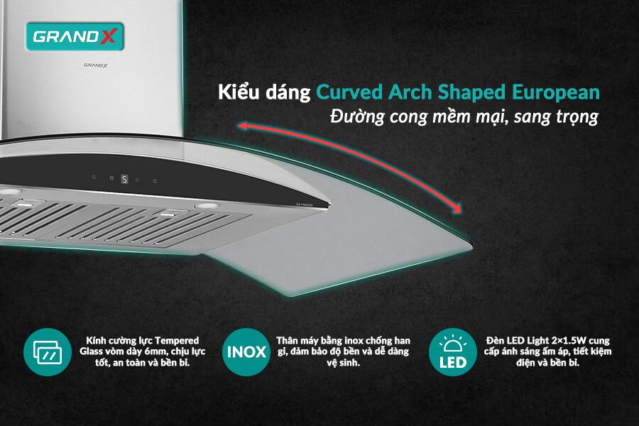 Hút mùi GX H70C55 sở hữu thiết kế Curved Arch Shaped European với những đường cong tinh tế, mang đến cảm giác mềm mại, thanh lịch và hiện đại, góp phần làm nổi bật phong cách không gian bếp.