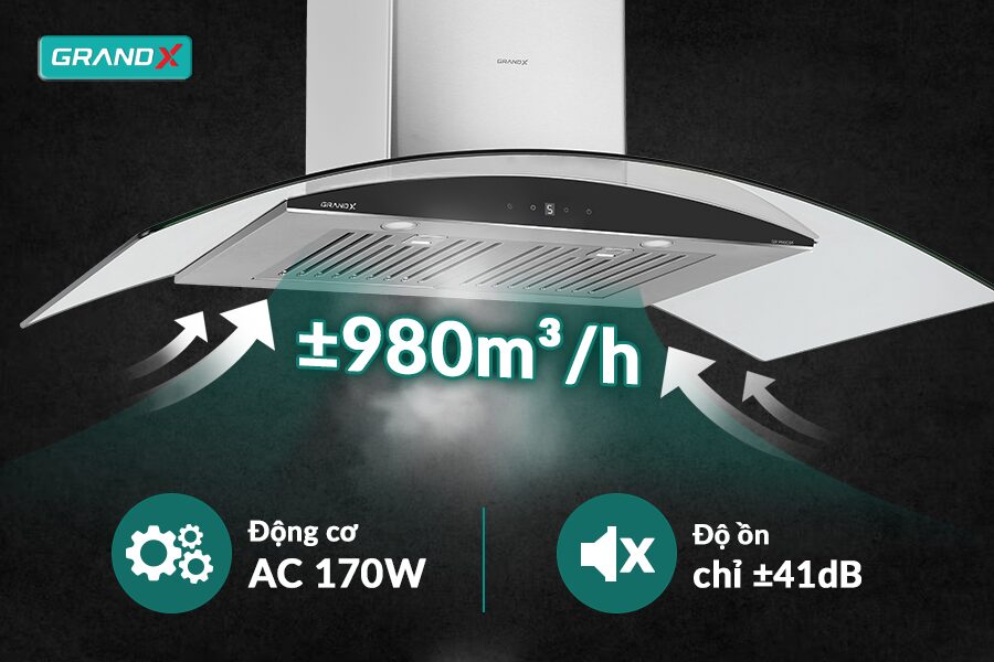 Hút mùi GX H70C55 có công suất hút mạnh mẽ ±980m³/h – Loại bỏ nhanh chóng khói và mùi khó chịu
