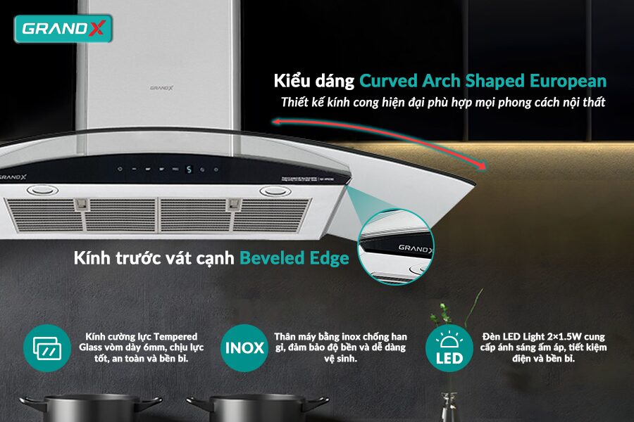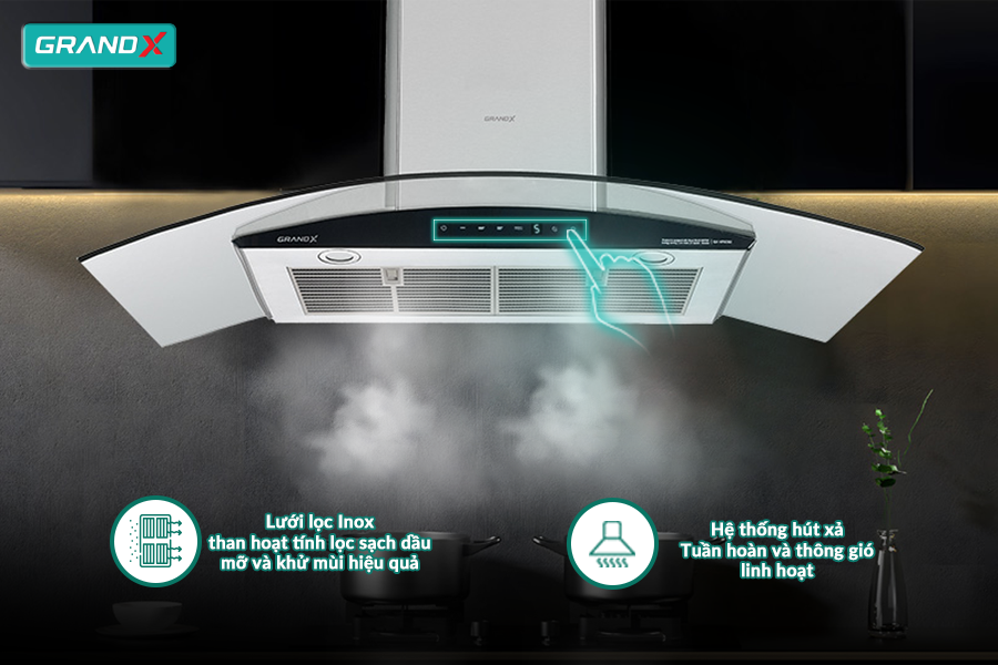 Hút mùi GX H70C62 (900mm) không chỉ sở hữu thiết kế kính cong sang trọng mà còn nổi bật với khả năng hút khử mùi mạnh mẽ và công nghệ động cơ tiên tiến.