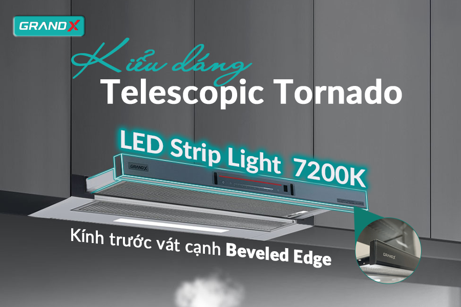 Hút mùi GX H70F72G sở hữu thiết kế Telescopic Tornado tinh gọn, đặc biệt phù hợp với những căn bếp diện tích nhỏ hoặc lắp đặt âm tủ để tiết kiệm không gian.