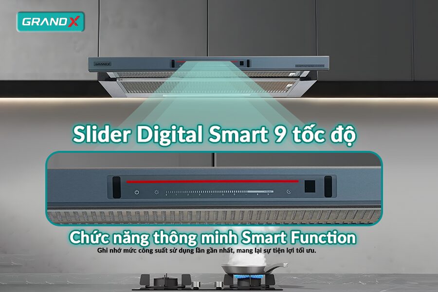 Hút mùi GX H70F72G được trang bị bảng điều khiển cảm ứng Slider Digital Smart, cho phép người dùng dễ dàng lựa chọn 9 mức tốc độ hút khác nhau, kèm theo chế độ Supper Booster mạnh mẽ khi cần xử lý nhanh lượng khói và mùi lớn.