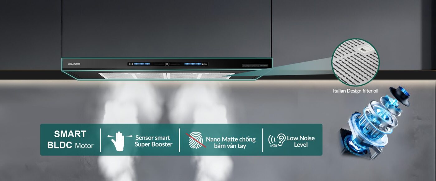 Đặc biệt, nhờ động cơ Smart Inverter BLDC 90W – công nghệ tiên tiến nhất hiện nay, GX H70F85B hoạt động mạnh mẽ nhưng cực kỳ êm ái, độ ồn chỉ ≤42dB, phù hợp cả với căn hộ chung cư hay nhà phố kín gió. Không những vậy, công nghệ inverter giúp máy tự động điều chỉnh tốc độ phù hợp với lượng khói – từ đó tiết kiệm đến 60% điện năng so với các dòng hút mùi thông thường.