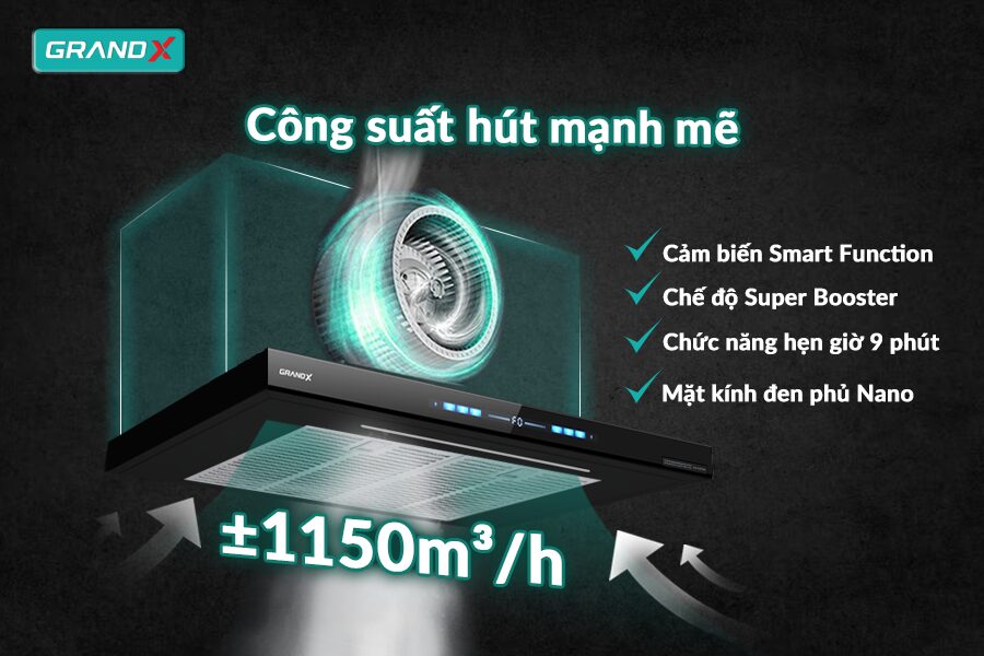 Hút mùi GX H70F85B không chỉ ghi điểm ở thiết kế tinh gọn mà còn ở hiệu suất làm sạch mạnh mẽ. Với công suất hút đạt tới 1150m³/h, máy dễ dàng loại bỏ khói dầu, mùi thức ăn chỉ sau vài phút nấu nướng, giúp gian bếp luôn thông thoáng và dễ chịu.
