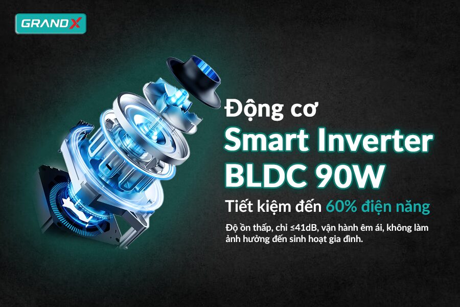 - Động cơ Smart Inverter BLDC 90W: Vận hành êm ái, bền bỉ, tiết kiệm đến 60% điện năng tiêu thụ.