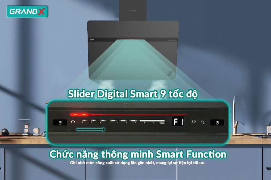 Hút mùi GX H90S86G được trang bị hệ thống điều khiển cảm ứng Slider Digital Smart hiện đại, cho phép lựa chọn linh hoạt 9 cấp độ hút, trong đó có chế độ Supper Booster giúp tăng công suất tối đa trong thời gian ngắn, xử lý nhanh chóng khói và mùi nặng.