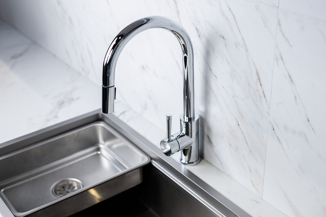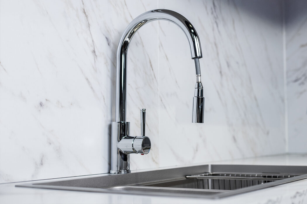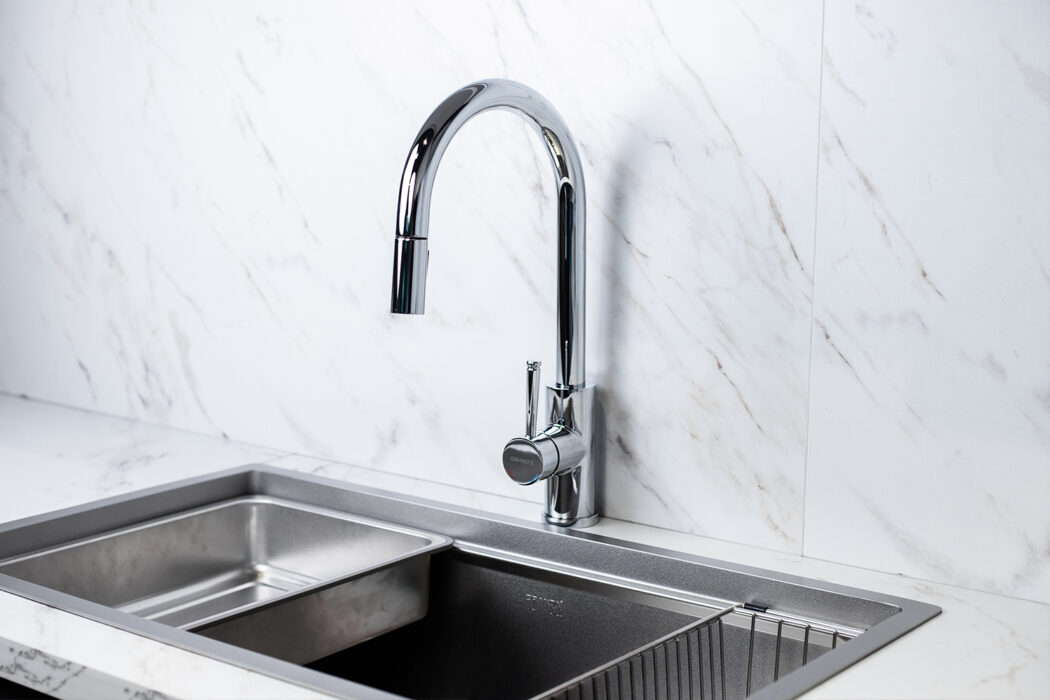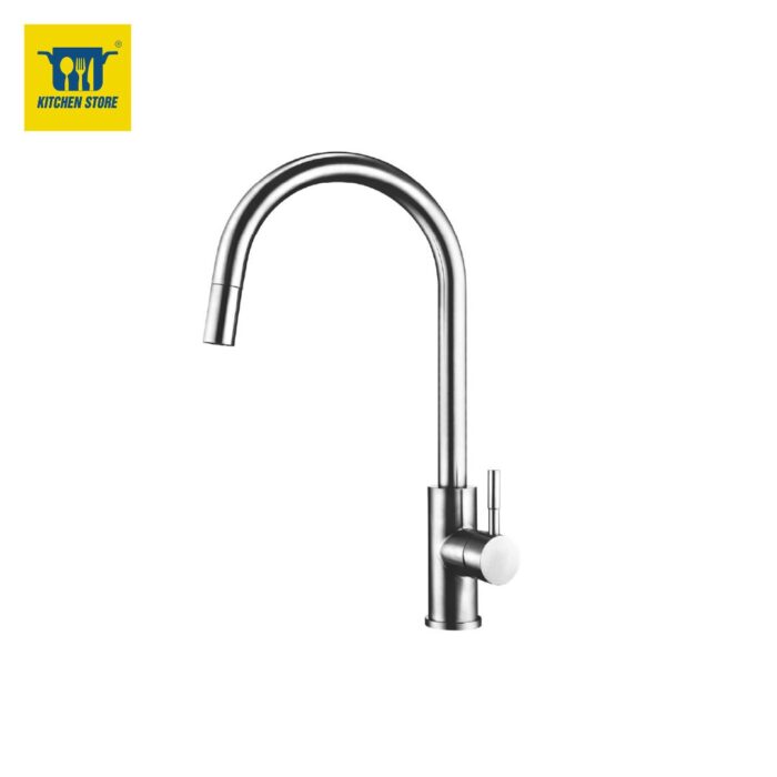 Điểm nổi bật nhất là vòi rút kéo linh hoạt (Pull-out spray) – cho phép bạn kéo đầu vòi ra xa, thuận tiện khi rửa nồi chảo lớn hoặc vệ sinh quanh bồn rửa. Sau khi sử dụng, dây rút tự động thu hồi nhẹ nhàng, giúp khu vực bếp luôn gọn gàng.